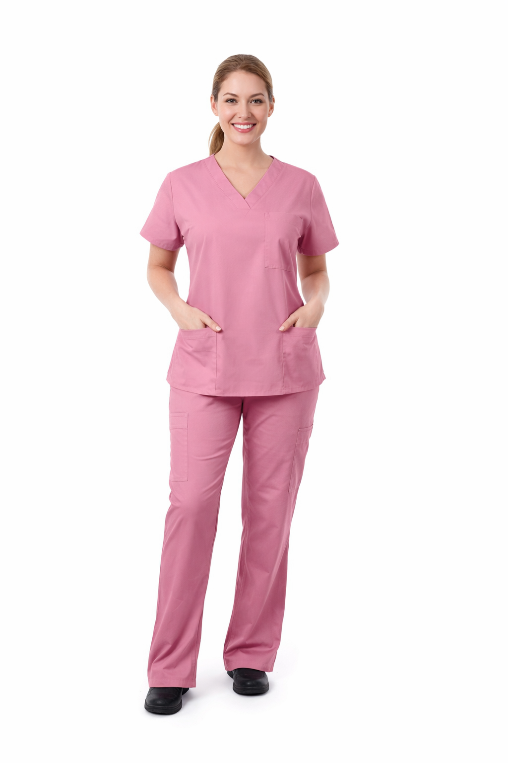 This women’s medical scrub set is designed to deliver all-day comfort, functionality, and a polished professional appearance. The V-neck scrub top offers a flattering fit with practical front pockets, while the matching pants provide ease of movement and a secure, comfortable fit throughout long working hours. Made from breathable, easy-care fabric, this set is ideal for nurses, doctors, caregivers, and healthcare professionals who need durability and comfort without compromising style.